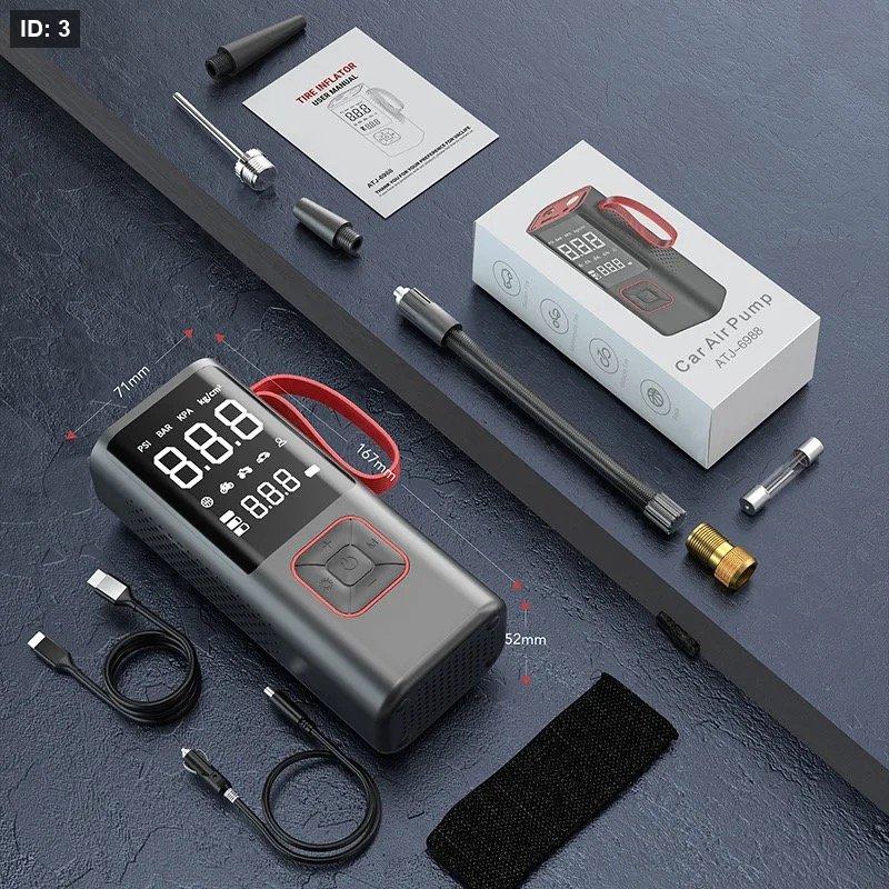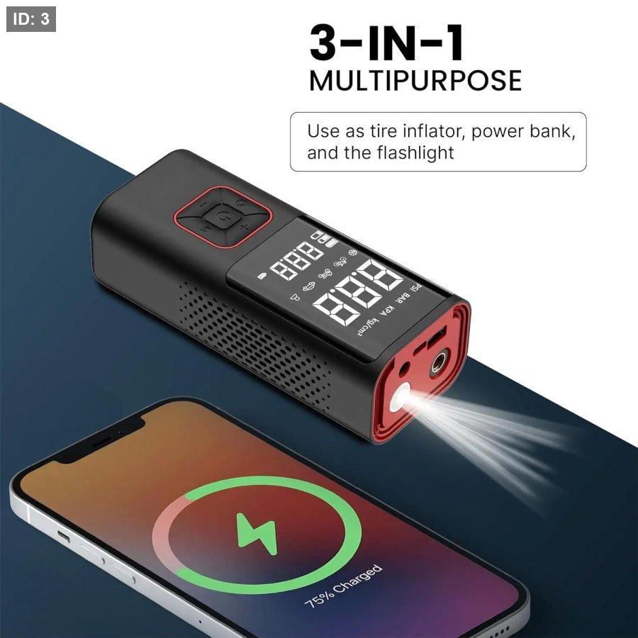 تصميمه المحمول والمدمج يتيح لك أخذه في السيارة بسهولة، كما يمكن استخدامه لشحن الأجهزة الإلكترونية بفضل خاصية الباوربانك، ليصبح صديقك المثالي لكل رحلة أو موقف غير متوقع على الطريق.